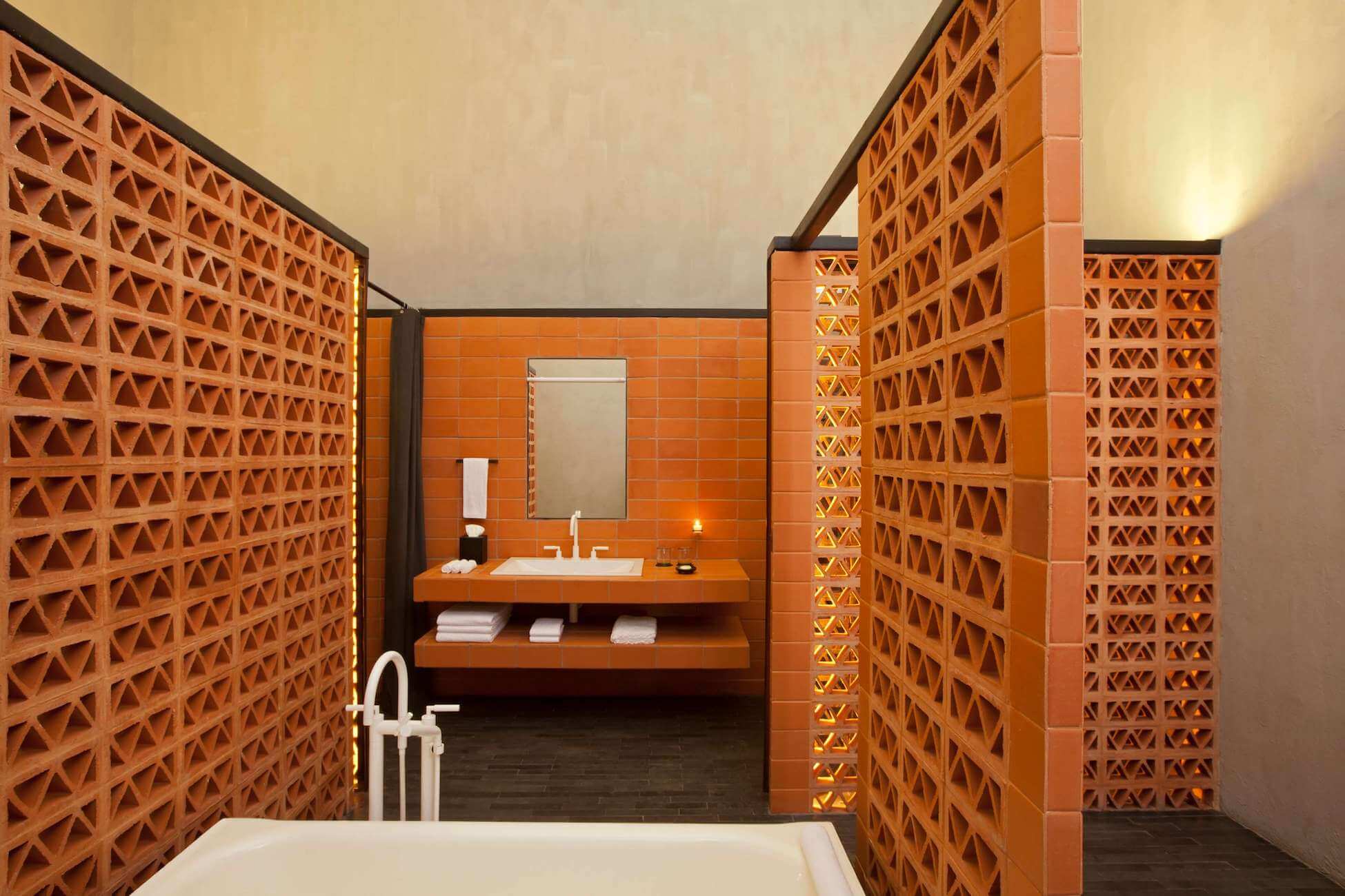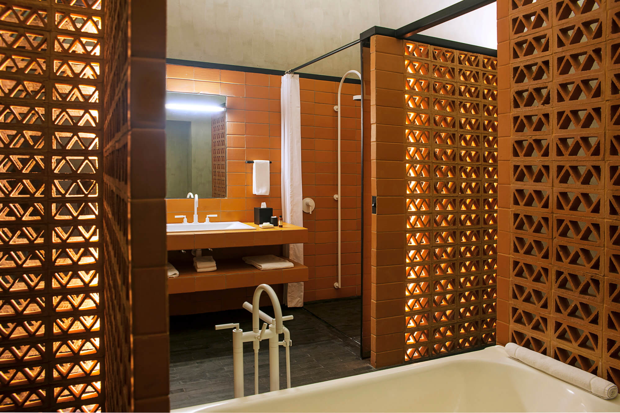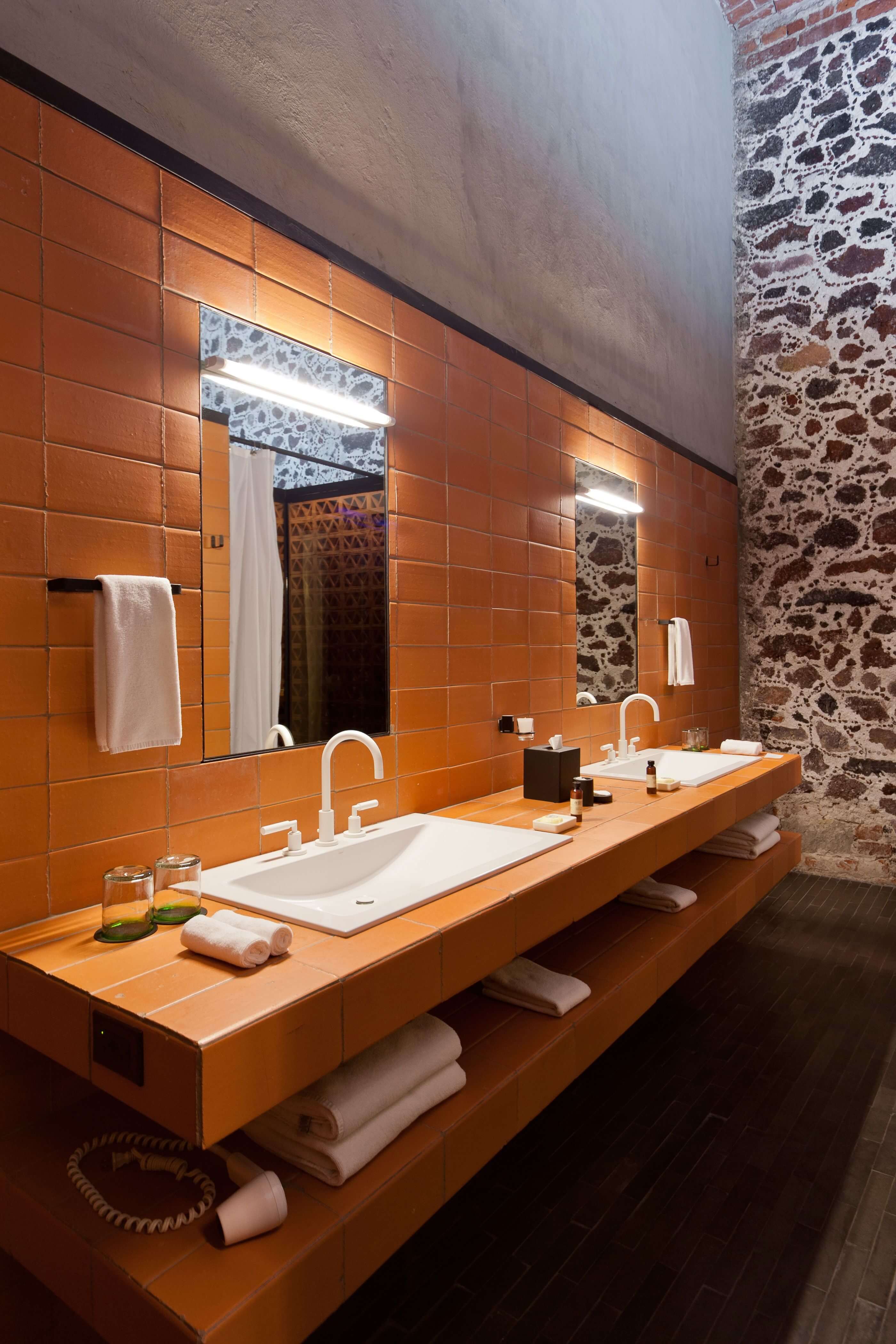 Un hermoso sitio de paredes de piedra volcánica roja, que se resguardaron al igual que la fachada original, azulejos hechos a mano y gloriosos patios que dan al edificio un estilo típico mexicano que le añade un estilo más contemporáneo, atribuyéndole una nueva identidad al carácter del edificio.