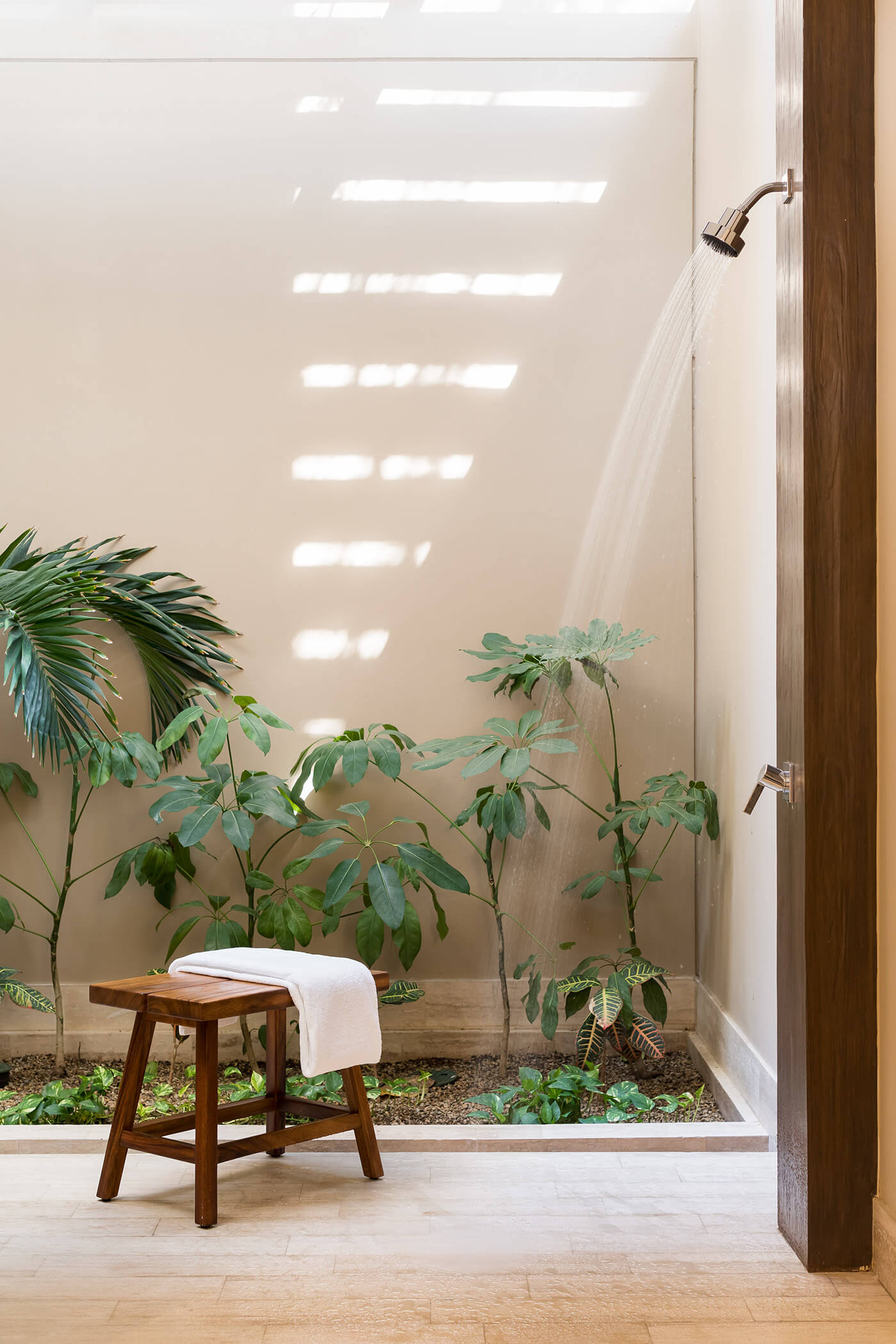 IMO de Dornbracht con su llamativo caño angular, combinado con proporciones acertadas con el cuerpo cilíndrico destaca entre la arquitectura, junto con la bañera Cape Cod de Duravit diseñada por Philippe Starck, de forma monolítica ofrece una superficie mate sedosa de tacto agradable.