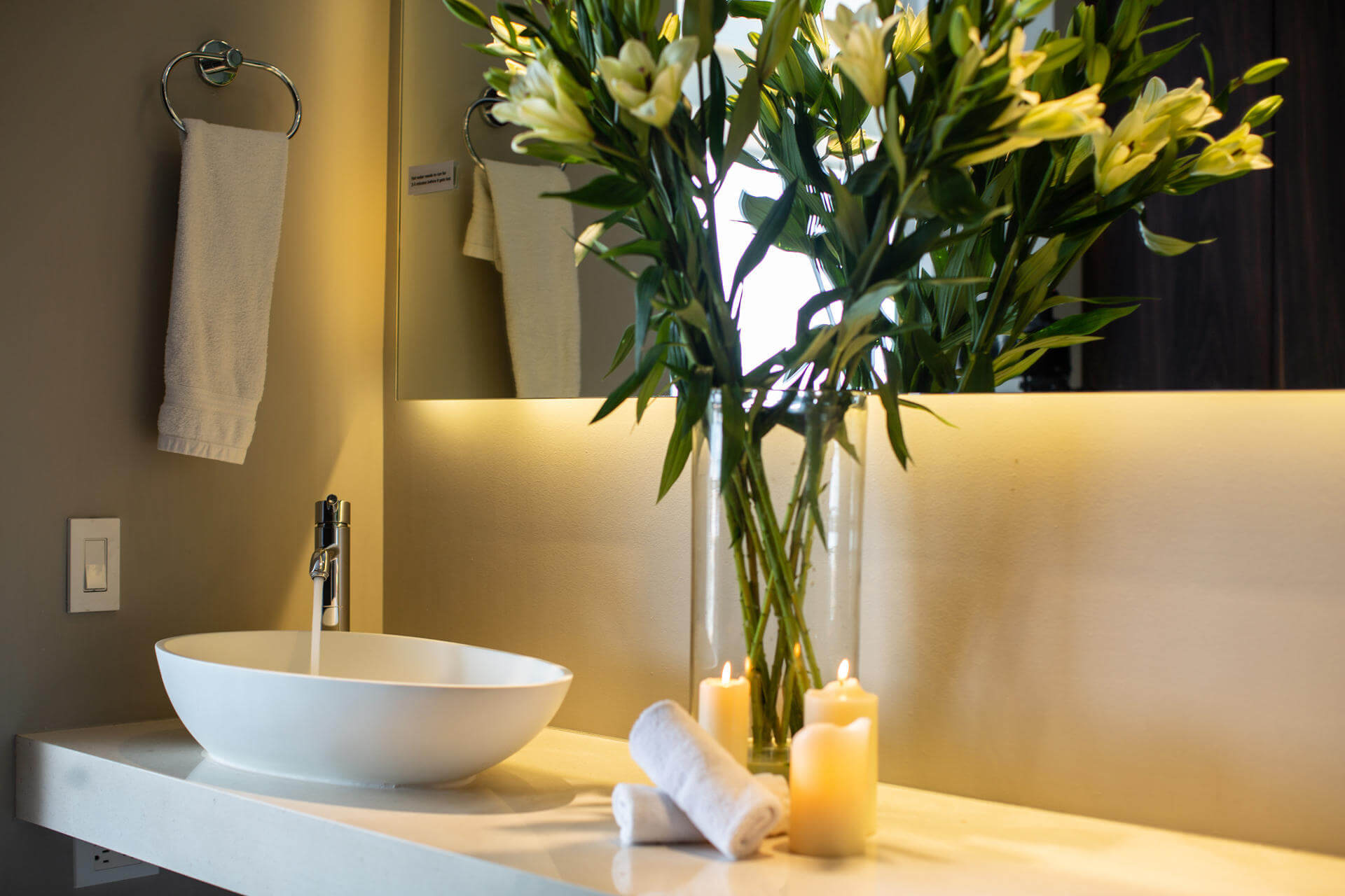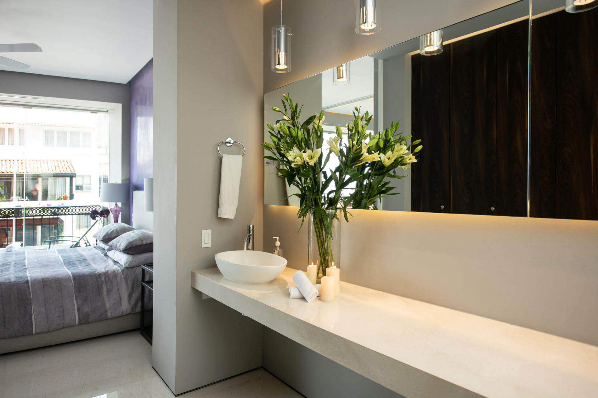 El diseño sereno de Meta.02 de Dornbracht refresca y permite que surjan nuevos espacios libres en los baños de estas habitaciones de gran espacio.